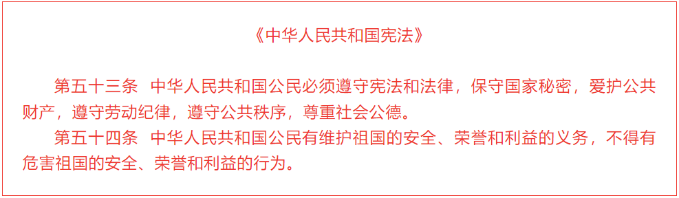其中,宪法第二章第五十三条、五十四条分别明确规定了公民的保密义务以及维护国家安全和利益的义务。⬇⬇⬇